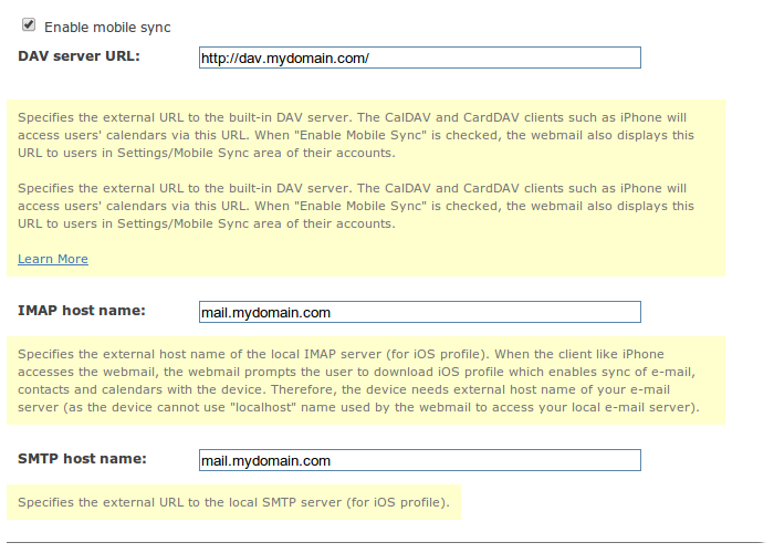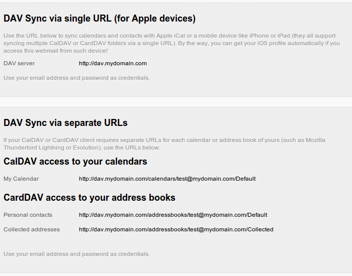 Now that you have this feature enabled, you can log into email account with WebMail Pro to find all the sync settings within user account settings screen. Some devices/applications require DAV server URL while other need URL pointing to specific calendar or address book, and Mobile sync screen of account settings contains all these.