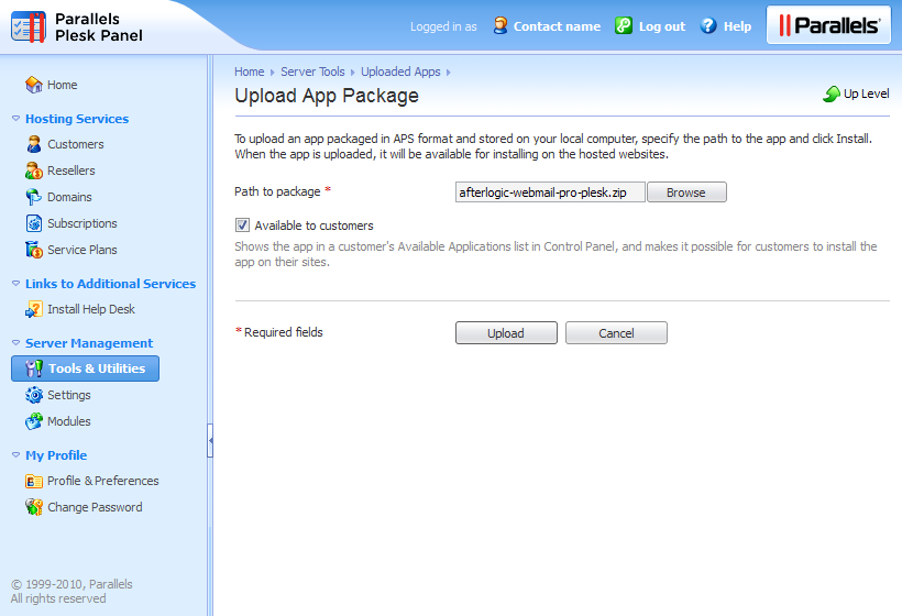 5. Click Upload to add WebMail Pro into Application Vault.