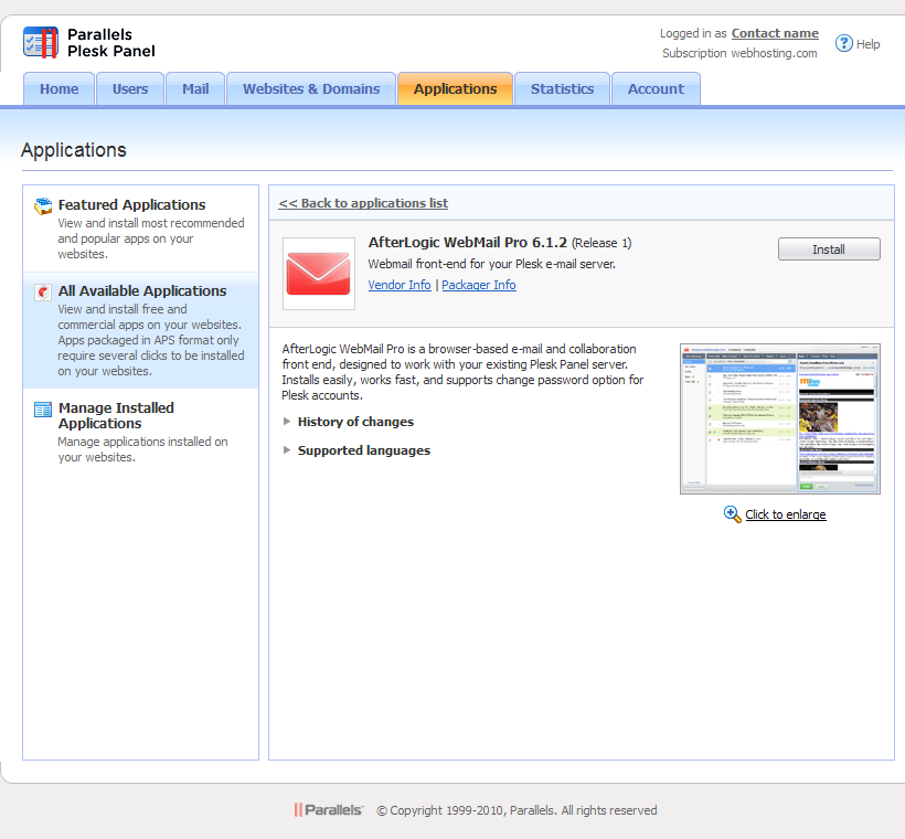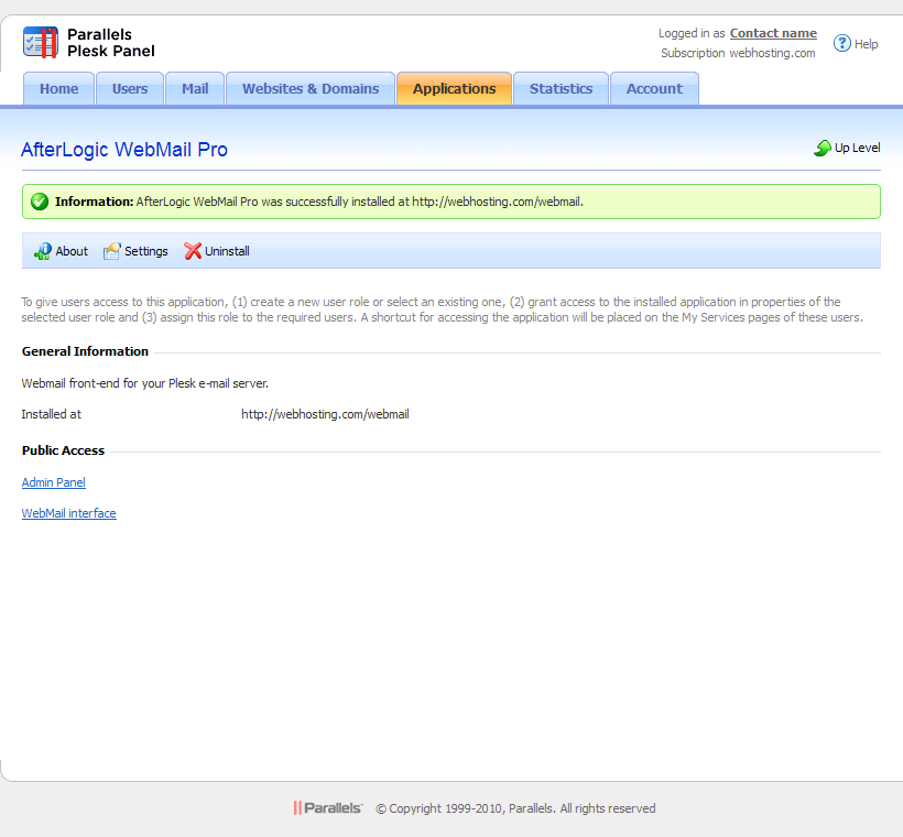 NOTE: If you didn't clear "Available to customers" checkbox when adding WebMail Pro into Application Vault, your hosting clients will be able to install their own instances of WebMail Pro onto their domains and manage them independently.