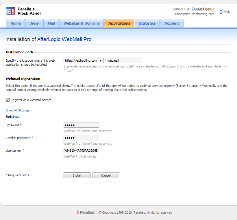 It's assumed that you install WebMail Pro to some primary domain (webhosting.com). All your clients will be able to check their Plesk e-mail accounts using a single instance of WebMail Pro (webhosting.com/webmail). To learn more, refer to How to install the product on Plesk Panel server.