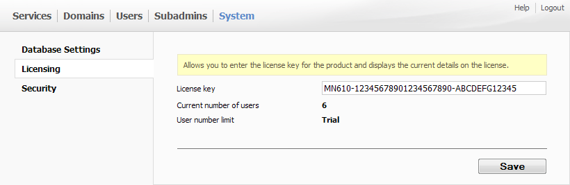 Displays max number of users allowed by current license key. Depending on the key, may also show "trial" or "unlimited".