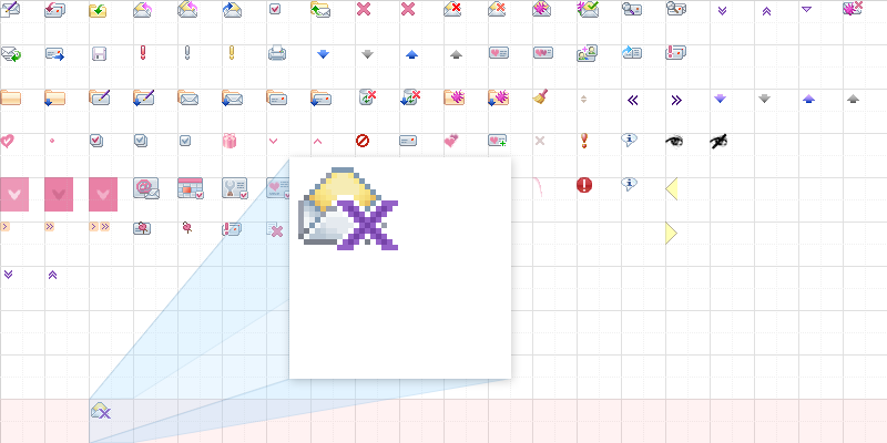 skins/skin_name/mail.png file holds all main icons used in WebMail. They are packed into a single file to eliminate multiple images load on a page which improves total page load performance. mail.png image is split to grid with 40x40 sized cells for convenience, it should be large enough to hold icons for any skin in a single grid cell. Cells’ coordinates are used in WebMail code. Any new icon should be placed into top left corner of free cell, it’s better to pick a cell closer to the bottom. If you placed icon to line 7 col 1, its coordinates are x: 6, y: 0.