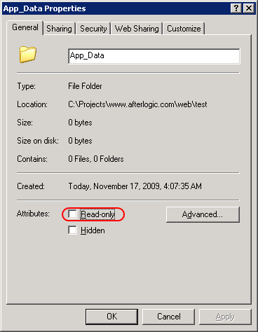 1. In Windows Explorer, go to C:\Inetpub\wwwroot\WebMailPro\ folder, right-click App_Data folder and choose "Properties":
