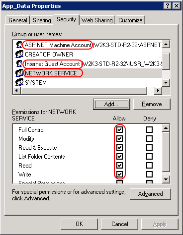 3. In "Security" tab, grant Full Control permission to ASPNET, NETWORK SERVICE and Internet Guest Account accounts: