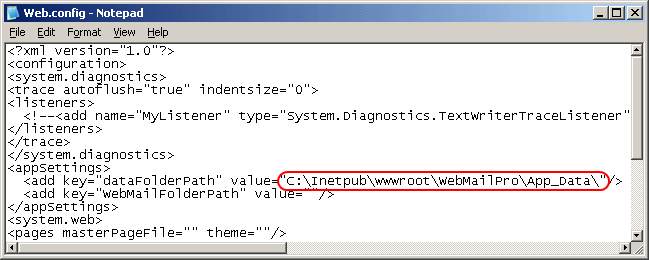 2. Run standard Windows Notepad, open C:\Inetpub\wwwroot\WebMailPro\web.config file for editing and locate the following key:
