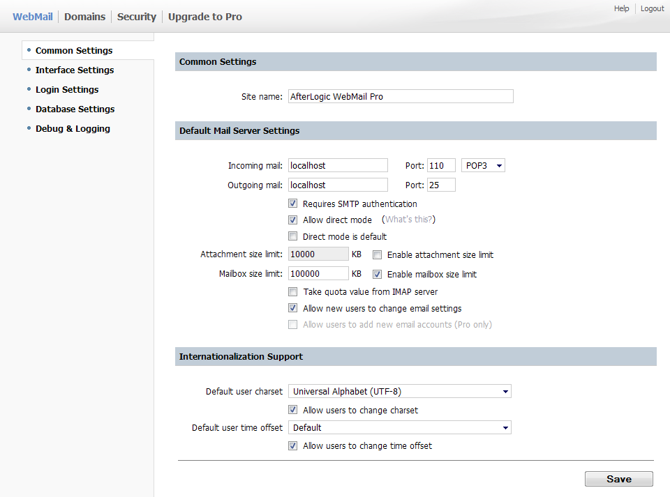 This area allows you to configure the most fundamental settings of WebMail Lite: default mail server settings, initial values for options of new user accounts, limits for message and/or attachment size etc.