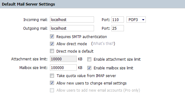 This option makes all new POP3 accounts and all IMAP folders be synchronized in Direct Mode by default. In Direct Mode, AfterLogic WebMail Lite works directly with the mailbox on mail server (mails are always taken directly from mail server), database is used only to store user accounts and address books (mails are not stored in database).