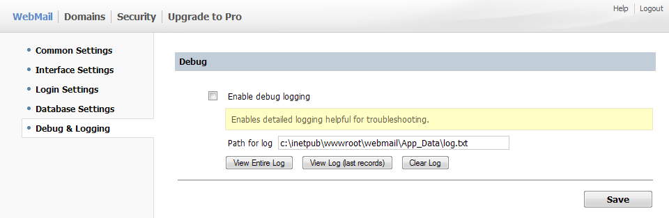If anything suddenly goes wrong with WebMail Lite, the first thing to do is to check the debug logs, and of course you need to have them enabled and configured, you can do that in this area of AdminPanel.