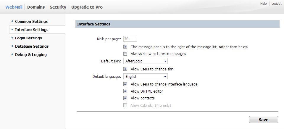 This area allows you to configure default look-and-feel options for WebMail Pro. For instance, you can set default skin or language and allow (or disallow) users to change that for their accounts. You can also disable rich-text editor and address book here.