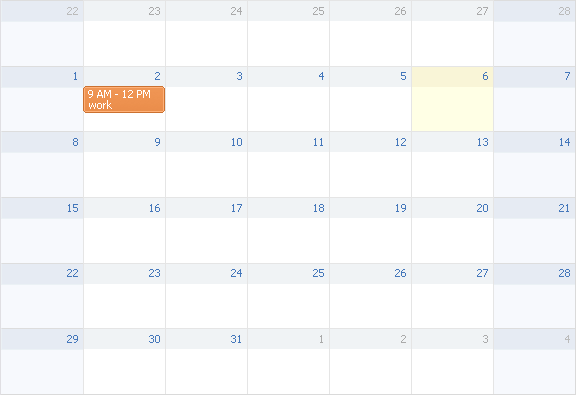 notworkday The look of lines in the main calendar area marked as non-working hours. rhead_notworkday The look of line headers marked as non-working hours. weekend_day The look of columns in the main calendar area marked as weekend. current_day The look of column of the current day. .work_area_month