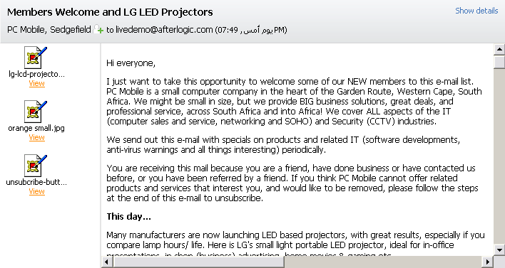 Email message layout displayed in View Message and Preview Pane mode.