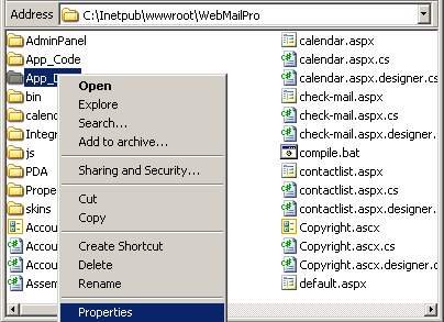 1. In Windows Explorer, go to C:\Inetpub\wwwroot\WebMailPro\ folder, right-click App_Data folder and choose "Properties":