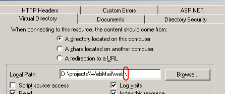 You should remove ending slash in the path specified in your WebMail virtual directory properties: