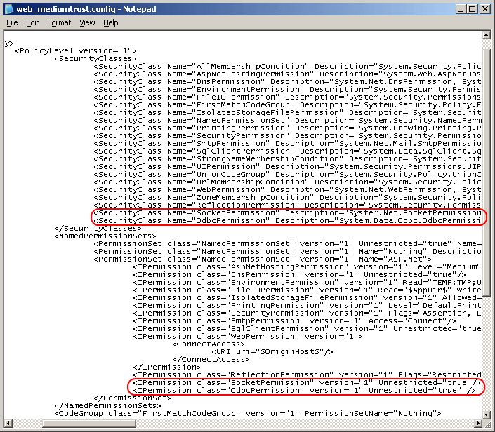 "No SocketPermission" or "No OdbcPermission" errors and "Medium Trust" policy